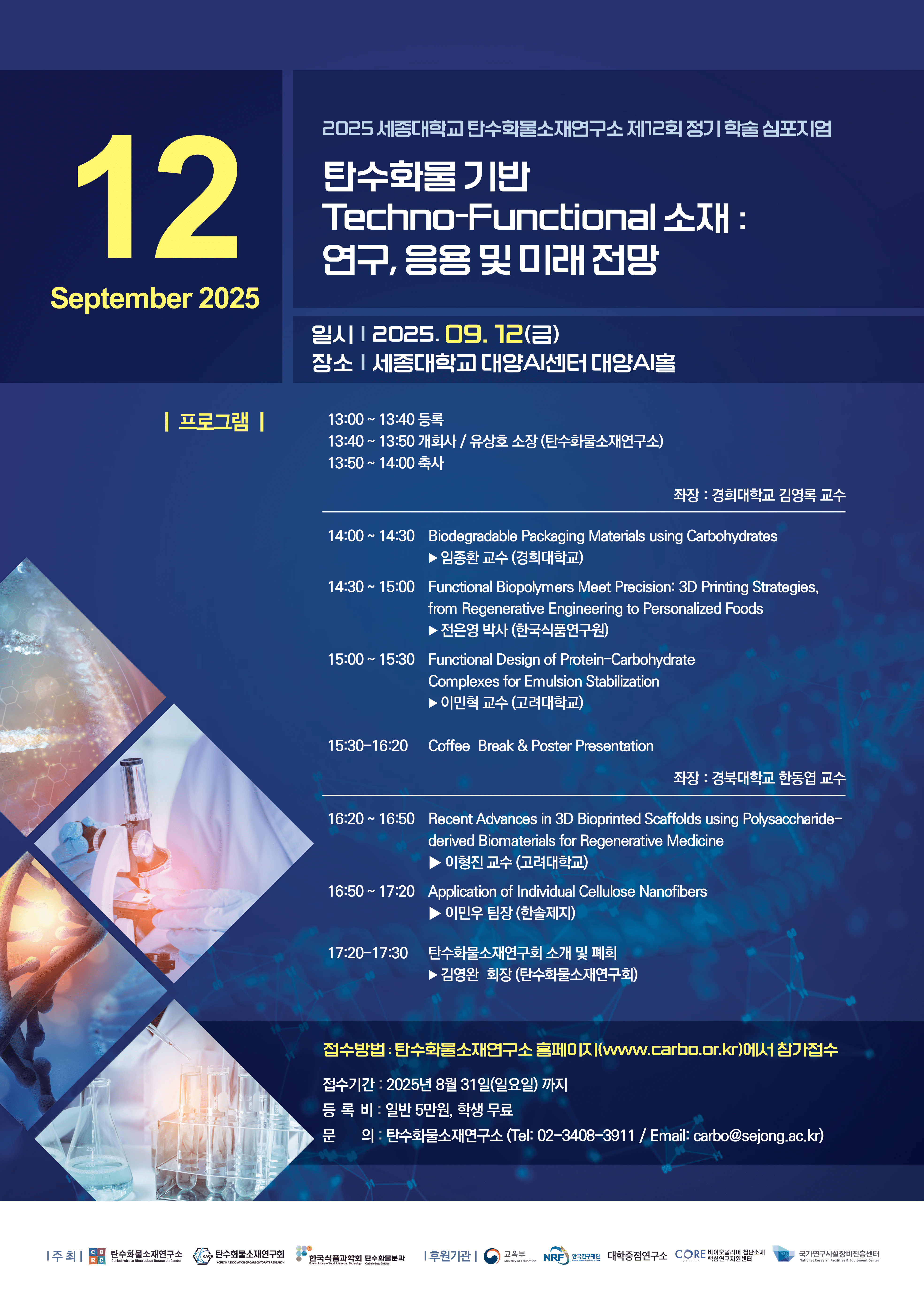 | 2025 세종대학교 탄수화물소재연구소 정기 학술심포지엄 [제12회:탄수화물 기반 Techno-Functional 소재: 연구, 응용 및 미래 전망] | ||